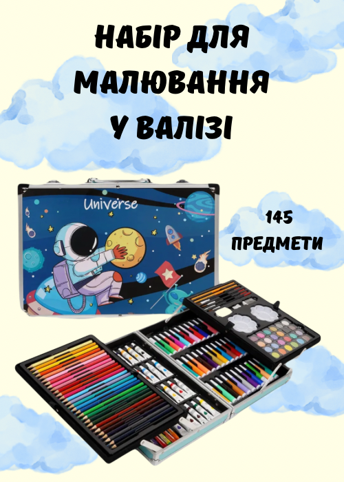 Розвивайте творчий потенціал вашої дитини з нашим набором для малювання у зручній валізі. Цей комплект складається з 145 якісних інструментів, включаючи фарби, олівці, фломастери, пензлі та багато інших матеріалів, що дозволяє малюкам створювати яскраві та оригінальні роботи.